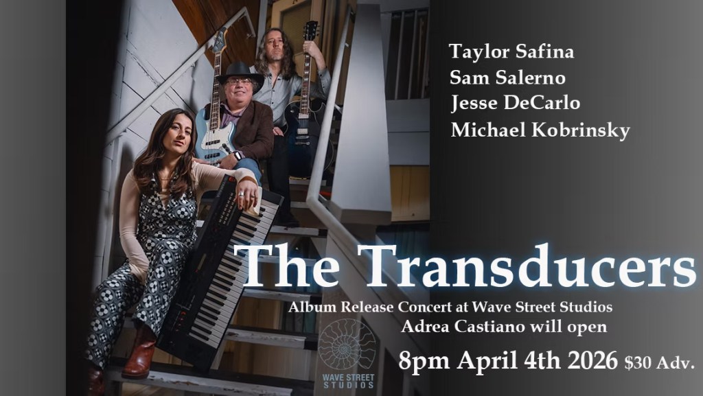 The Transducers are Taylor Safina on keyboard and vocals, Sam Salerno on bass and vocals, Jesse DeCarlo guitar and vocals, and Michael Kobrinsky and Steve Parmley on drums.