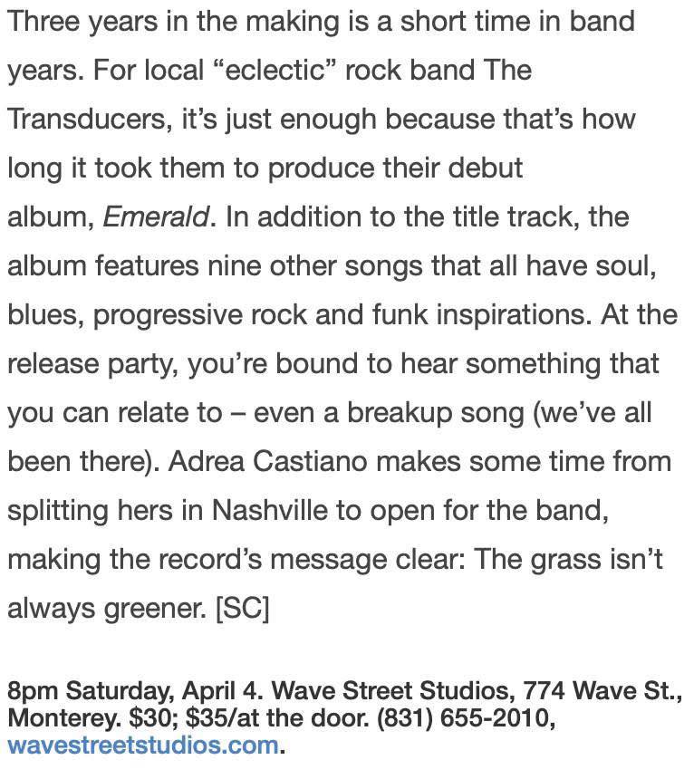 The Transducers are a breath of fresh air.” Chris Counts, The Carmel Pine Cone